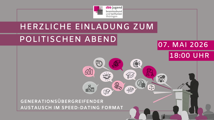 Die dbb jugend thüringen lädt zu einem politischen Abend am 07. Mai 2026 nach Weimar ein. Der Abend bietet die Gelegenheit sich in Kleingruppen im Speed-Dating-Format mit Entscheidungstragenden auszutauschen.