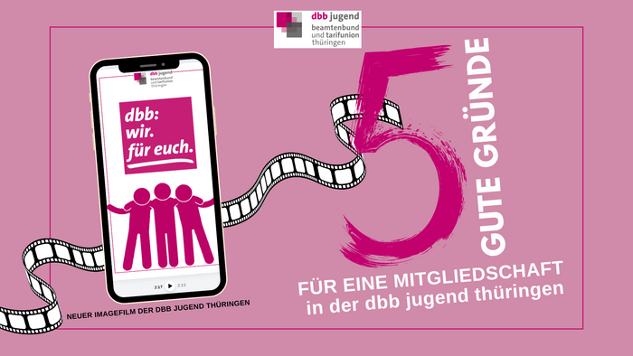 Die dbb jugend thüringen hat fünf gute Gründe für eine Mitgliedschaft gesammelt und diese kreativ in einem Reel zusammengefasst. Dieses ist ab sofort auf dem Social Media Kanal ersichtlich.